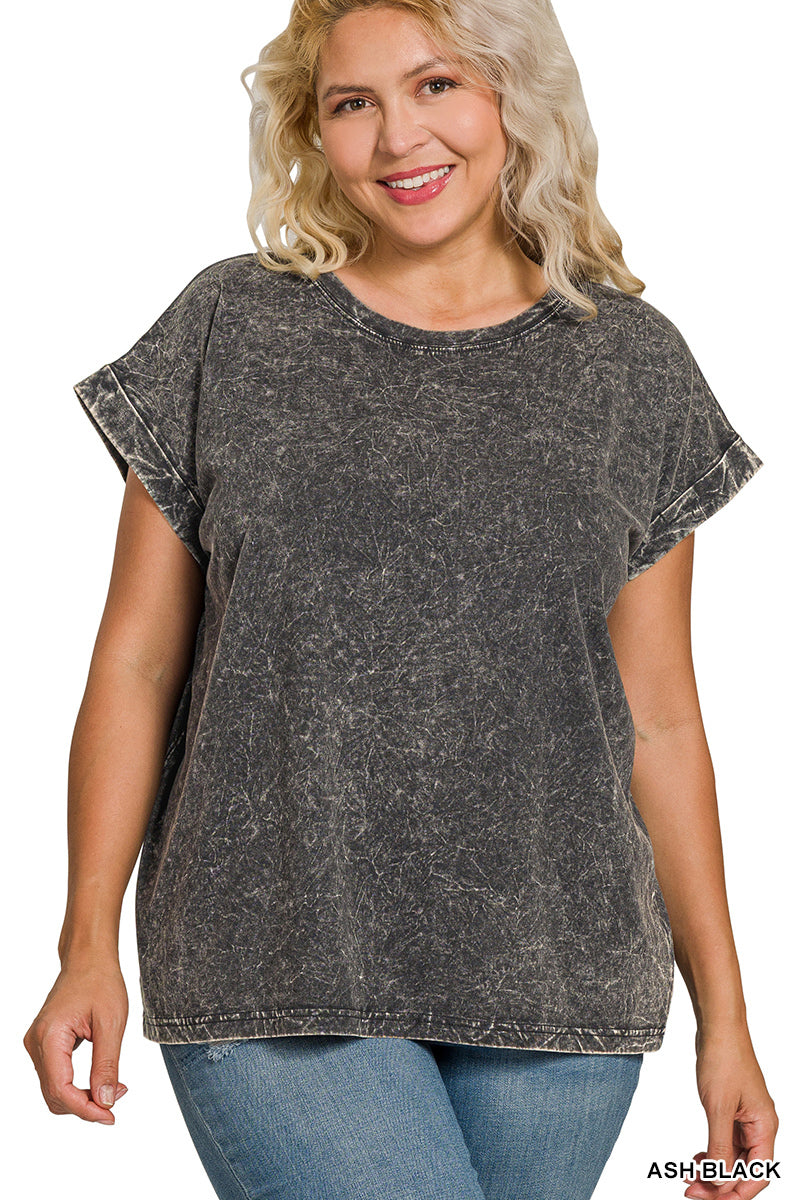 Plus crinkle washed round neck folded short sleeve tee. CTW-3382