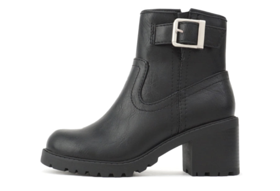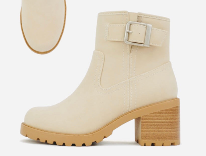 Beige or Black leather distressed boot with outside buckle, inside zipper and 2.5 inch heel.